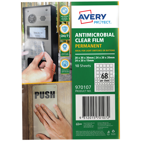 AVERY PROTECT ANTI MICROBIAL REMOVABLE FILM 1UP A4 PACK 10