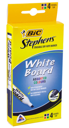BIC STEPHENS WHITEBOARD MARKER CHISEL 1MM ASSORTED PACK 4