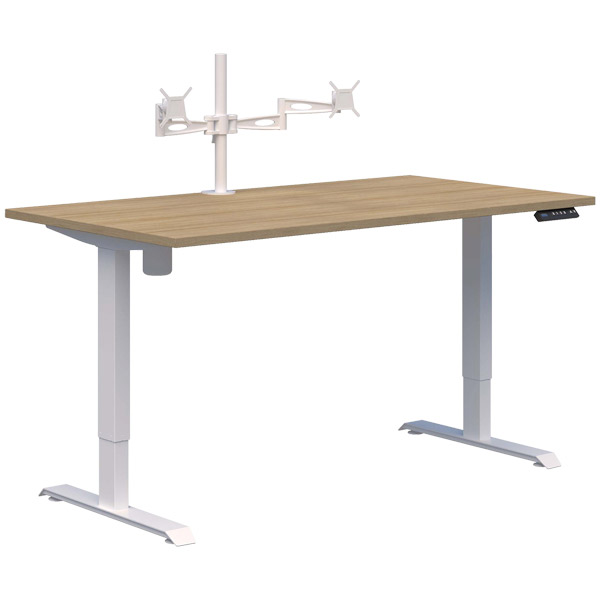 DUO II ELECTRIC DESK W1800 X D800 X H695-1145MM WHITE FRAME CLASSIC OAK WITH METALICON DOUBLE MONITOR ARM WHITE