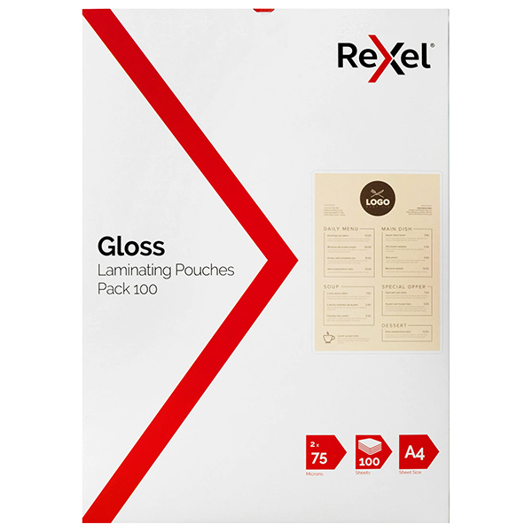 REXEL LAMINATING POUCH 75 MICRON A4 CLEAR PACK 100