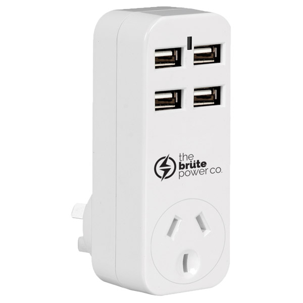 The Brute Power Co. adapter comes with one power outlets and 4 USB ports allowing the charging of two devices at the same time