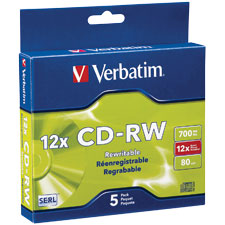 VERBATIM 95157 CD-RW 700MB 12X HIGH SPEED SLIM CASE SILVER PACK 5